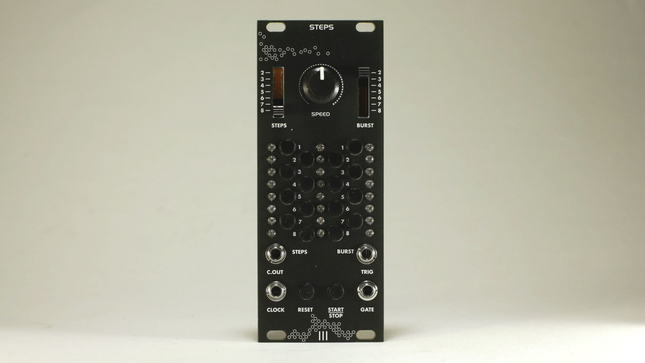 Tre Modular – Steps is a 8-step clock sequencer and processor that transforms incoming clock signals into a series of rhythmic patterns. Beyond basic sequencing, Steps incorporates features like individual step activation/deactivation and a burst mode that multiplies selected steps up to 8 times, generating complex rhythmic variations.